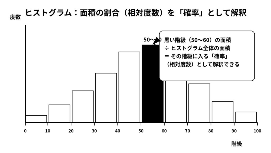 このようになるので、上の図を見ると50~60ぐらいの測定値を取る人の確率が一番高そうかな?と解釈できます。つまり、ヒストグラム上における、面積はその値をとる確率と一致すると言えます。